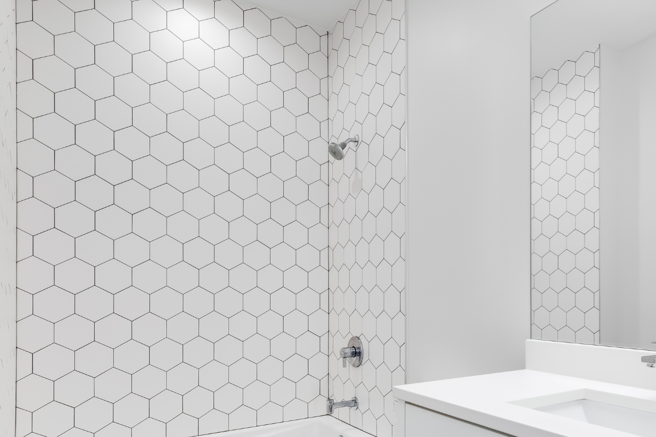 - バスルームの一面にヘキサゴンタイルを使用することで、視覚的な焦点を作り出します。