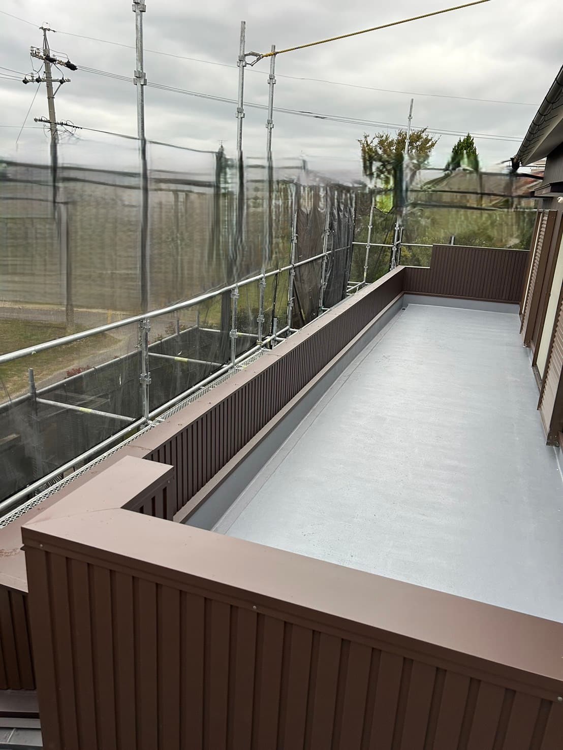 大工工事でバルコニーに勾配をつけ、排水溝も設置しました。理想を言えば、すべて解体して新しく作り直す方が良いのですが、バルコニーの下に居室があるため、大掛かりな工事が必要になり、雨仕舞も複雑になる可能性がありました。そのため、今回は現状を活かした仕様で施工しました。この方法は、コストを抑える意味でも最適です。防水工事が完了し、見た目もきれいに仕上がりました。