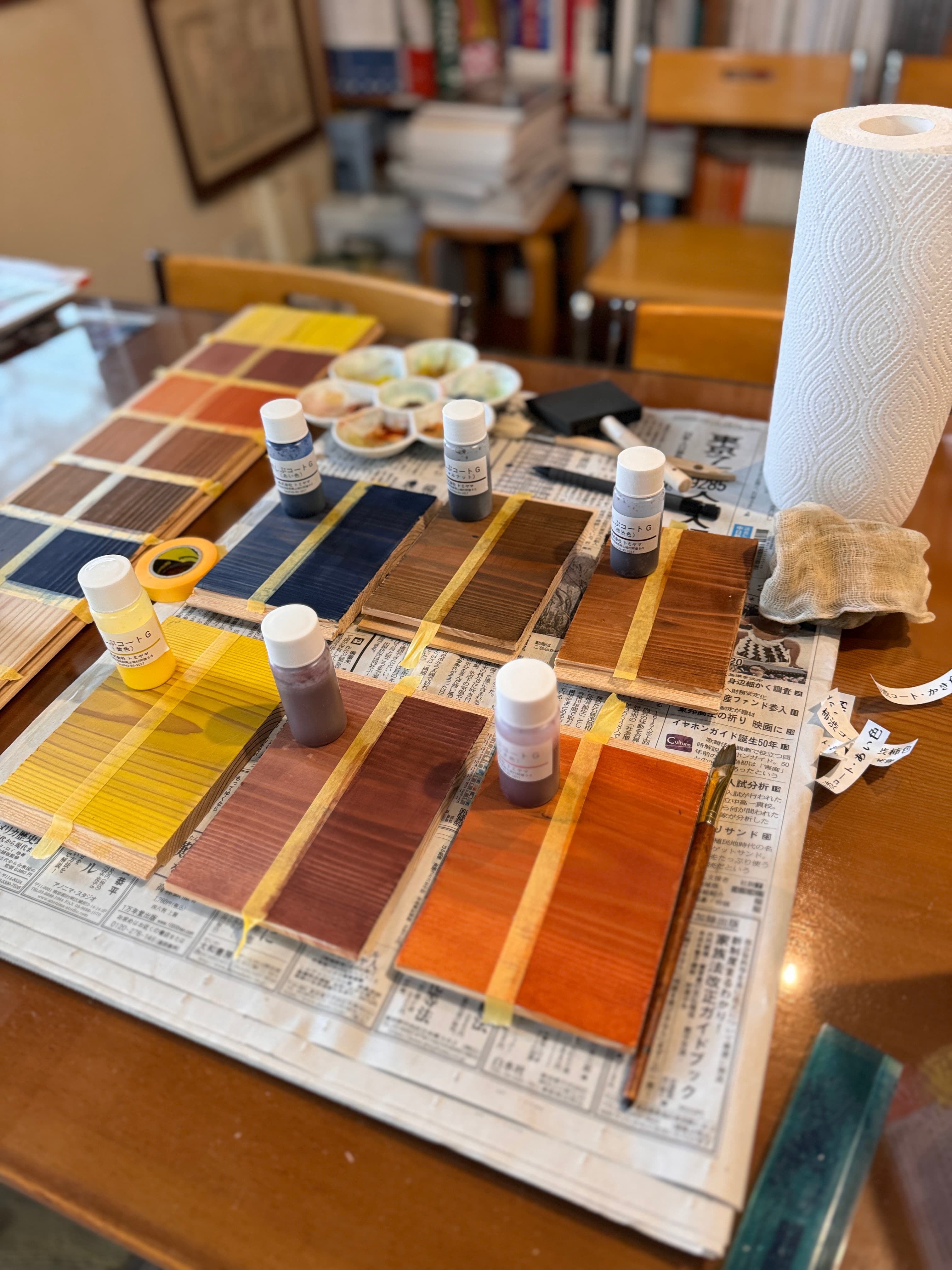今回は、リノベーション中のお施主様にも実際に見て、触れて、選んでいただけるよう、柿渋の色味を比べられるカラーサンプルをご用意しました。