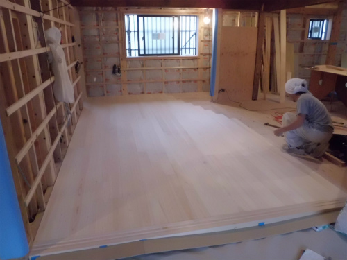 天井下地もだいぶ進んだので、あらちゃんは床張りを始めました。