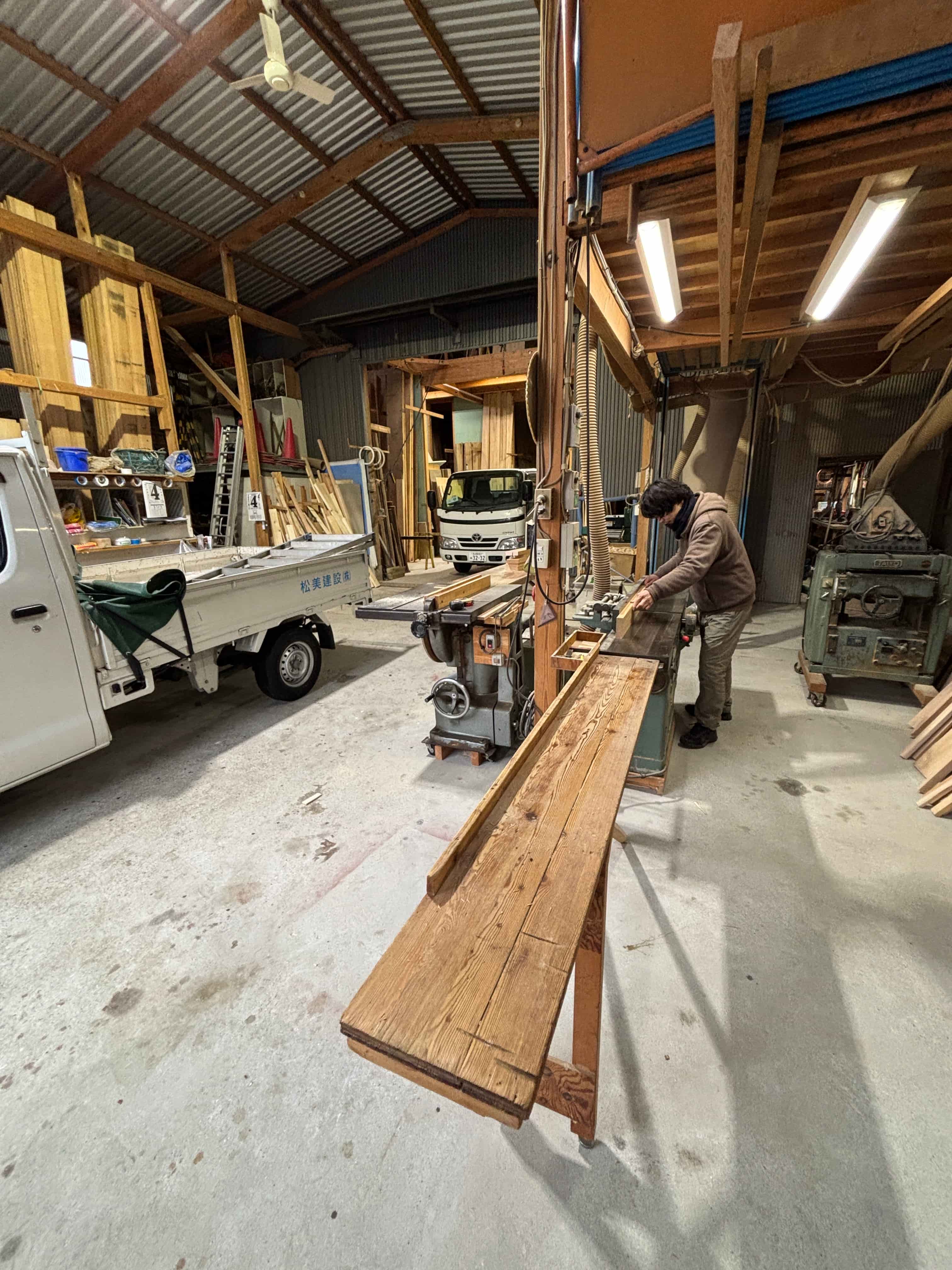 本日は、マツミの工場での様子からご紹介します。早朝、寺やんが最終仕上げ材の製作に取り組んでいました。加工が完了した部材はそのまま現場へ運びます。必要な部材をすぐに作ることができるため、、スムーズに作業が進められています。