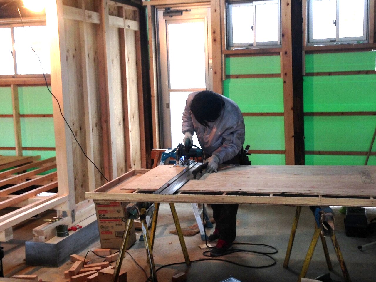 さて、階下では床下地工事の真っ最中です。桧の大引を入れて、根太を取付ける白井くん。