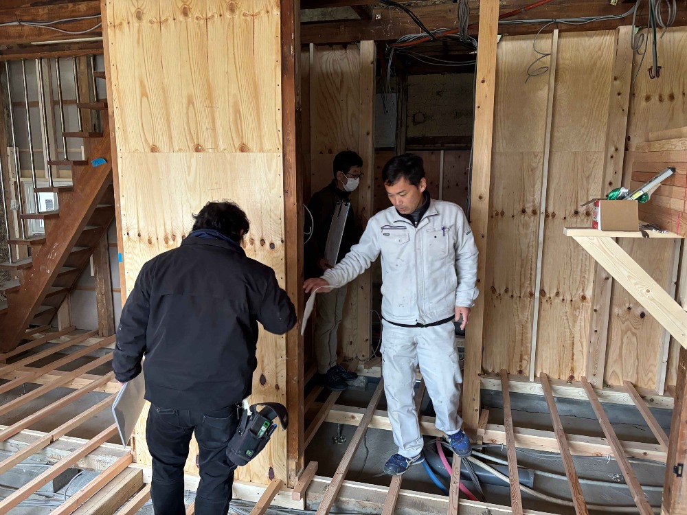 熊野屋様の古民家再生工事が始まりました。現場で打ち合わせ中です。