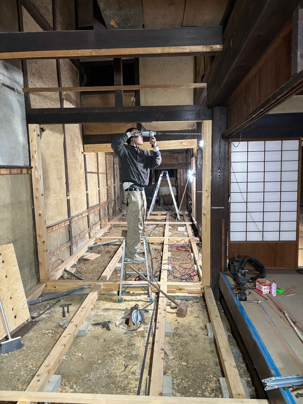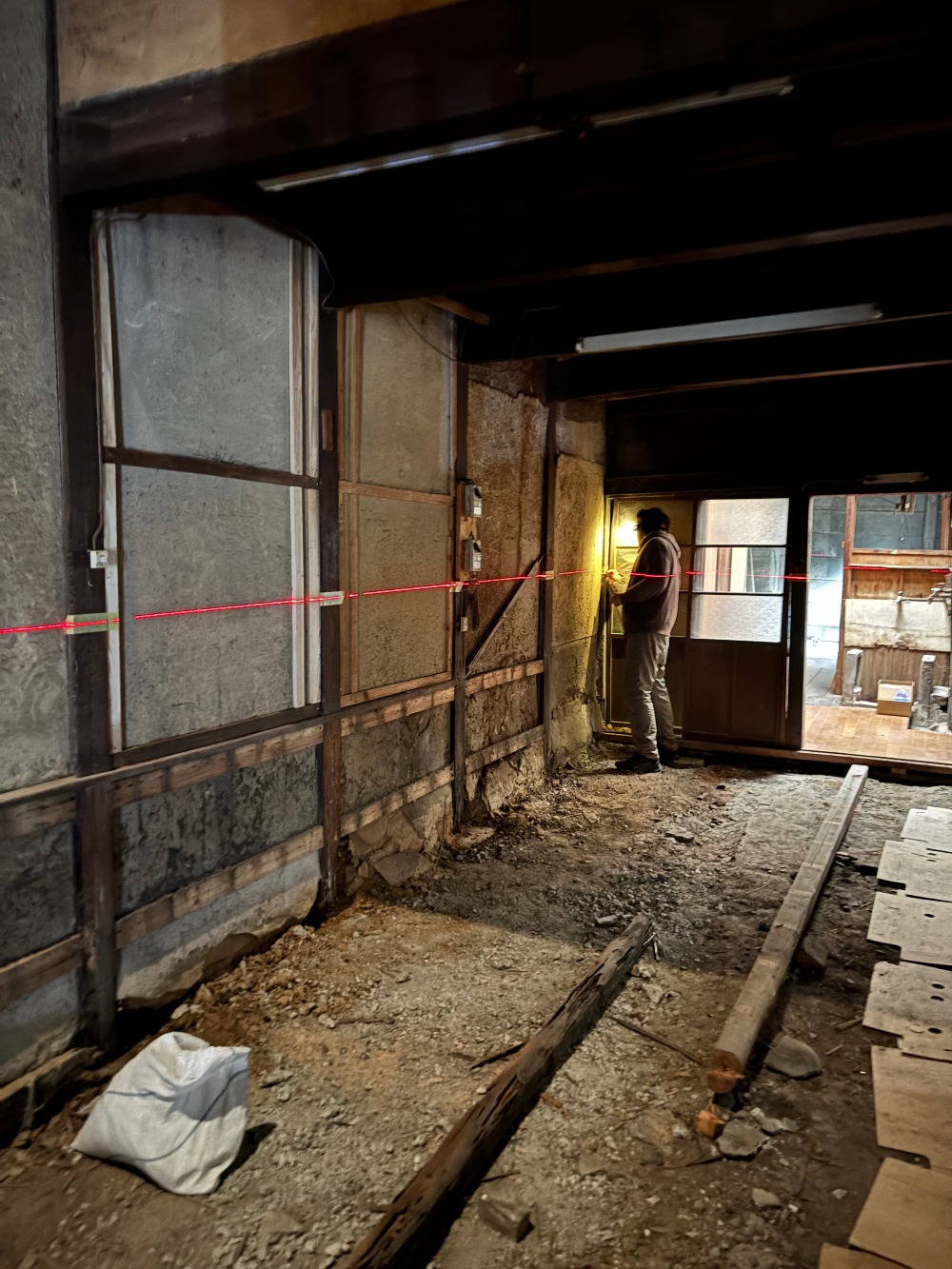 古民家が本屋になります。床の高さを決める為レベル(水平)を出しています。