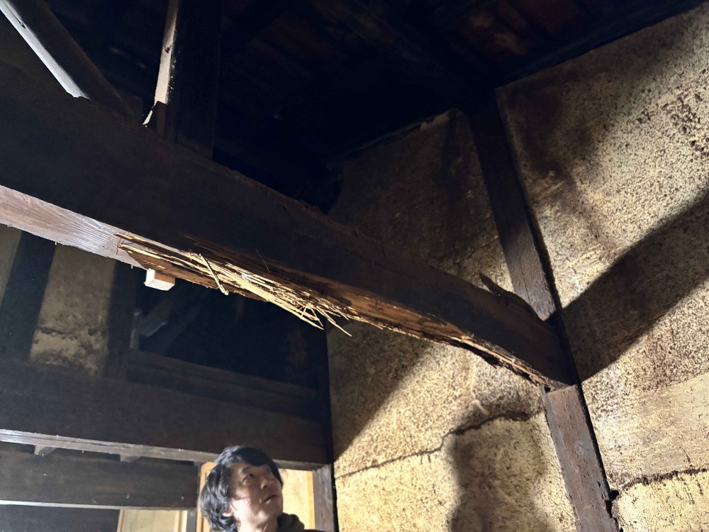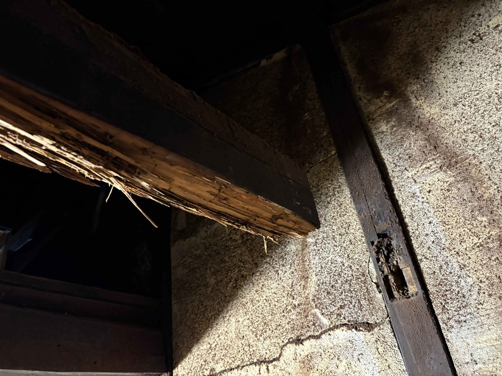 傷んでいる梁がどこまで進行しているか状態を詳しく確認するため、一部をカットして内部の傷み具合を調査しています。これから適切な補強方法を検討し、計画を進めていきます。(白井)