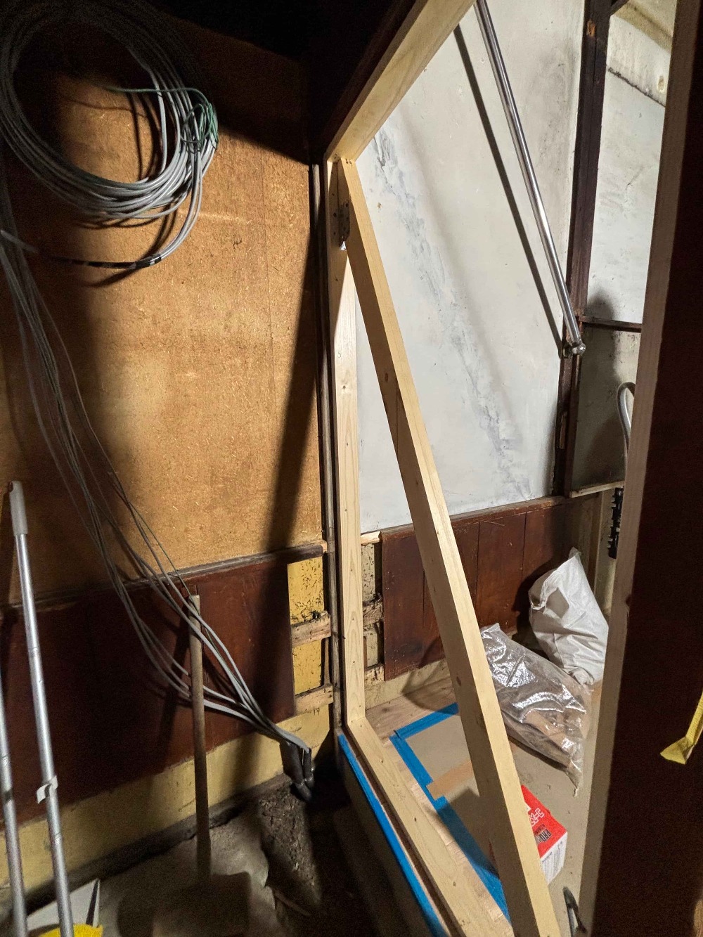 2階部分の耐震補強中。柱立てや筋交いを入れています(三浦)