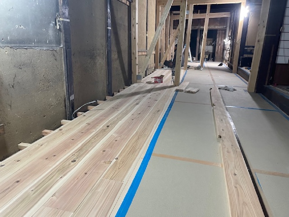 厚さ30ミリ、杉の床材を貼り進めていきます(白井)