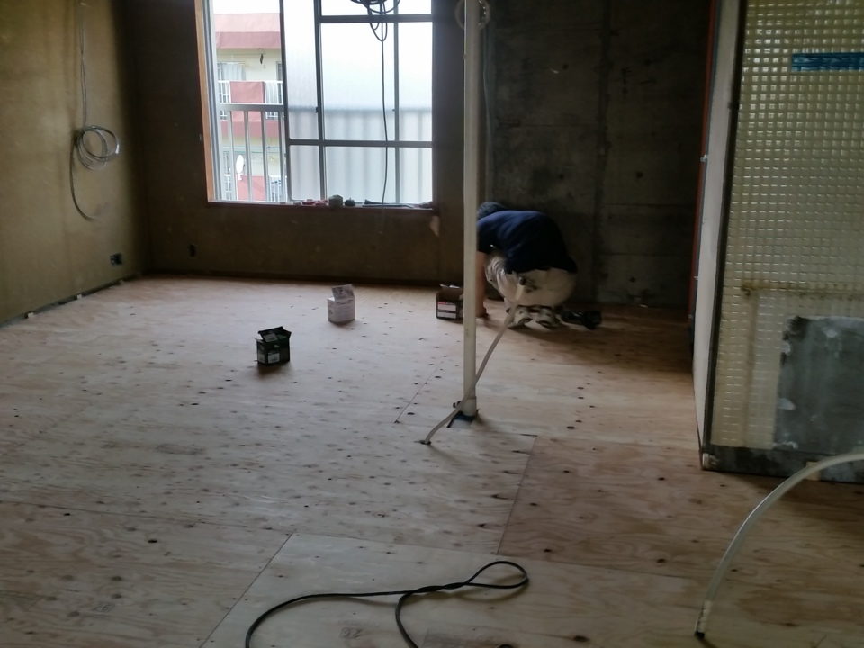 大工の中川です。天井PB張りも完了し、床の捨て張りを行っています。
