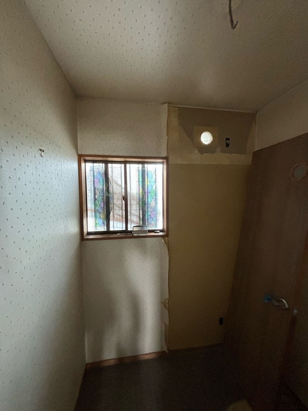 2階WCクロス作業開始です。クロス屋さんお願いします(白井)
