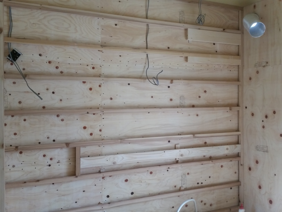 中川です、柱が飛んでいるので、横に耐力合板の下地を入れていきます。