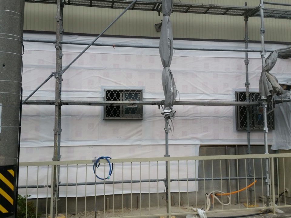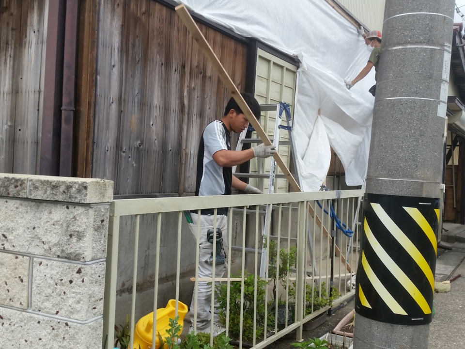 白井です、 トタンを捲り下地を取って、ビニール養生しました。