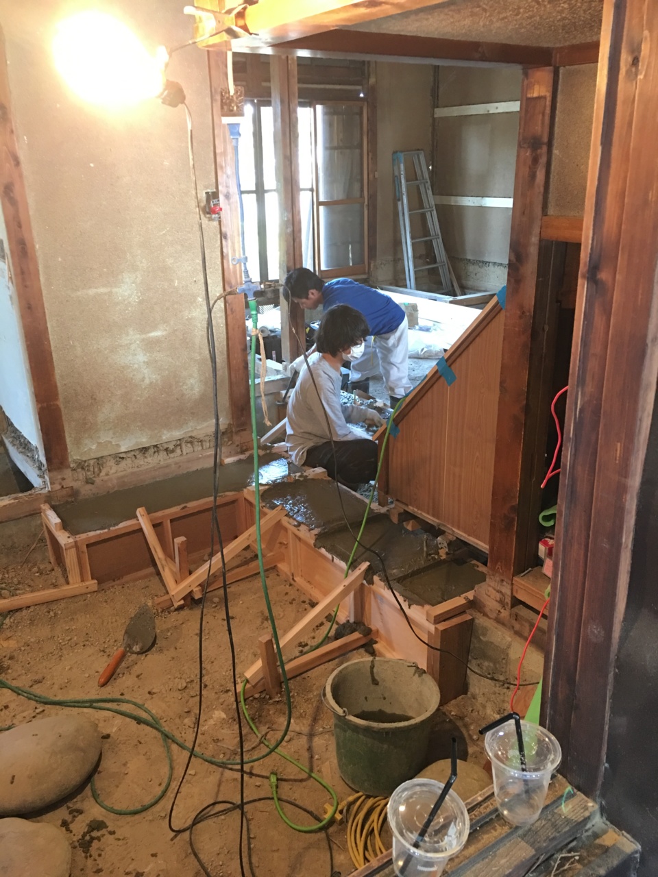 土間打ちを中川さんが頑張っています。松美の大工は何でもやれます