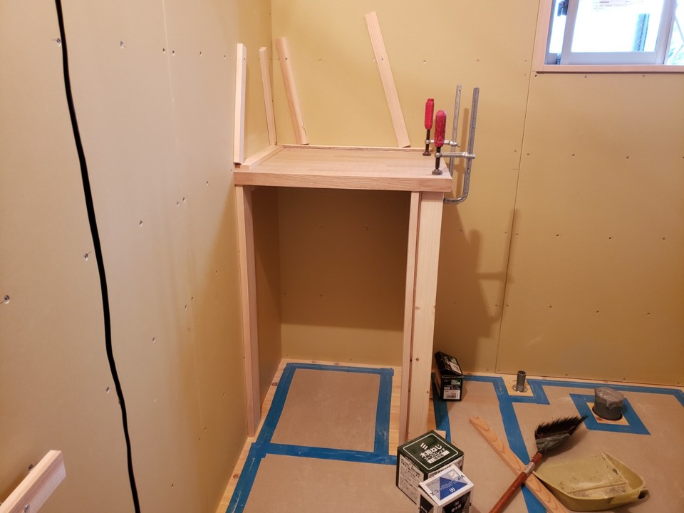 中川です。出隅(ですみ)の強度を増すためにクロス下地用合板を貼ってます。