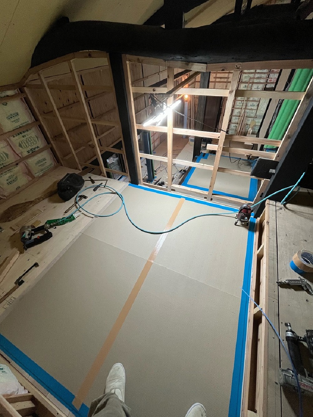 (物置小屋改修工事)勾配天井、壁下地の下地を施工しました(寺西)