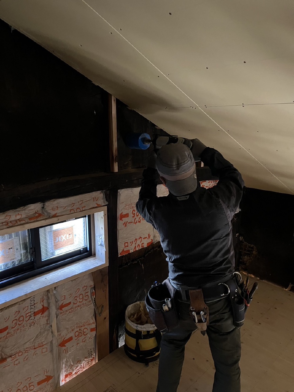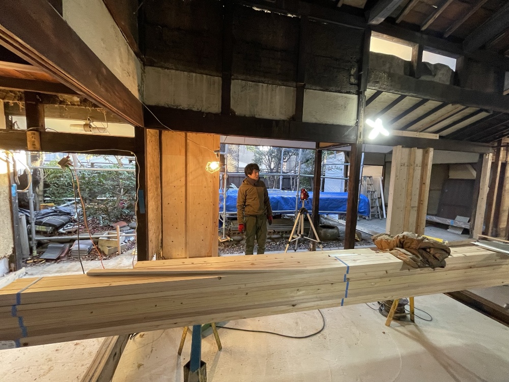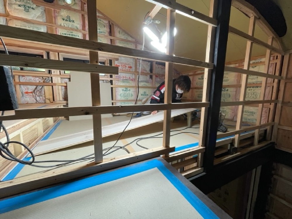 屋根垂木補強中のニューフェイス!頑張ってます(寺西)