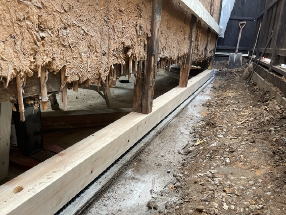 (物置小屋改修工事)桧の土台を施工中(寺西)