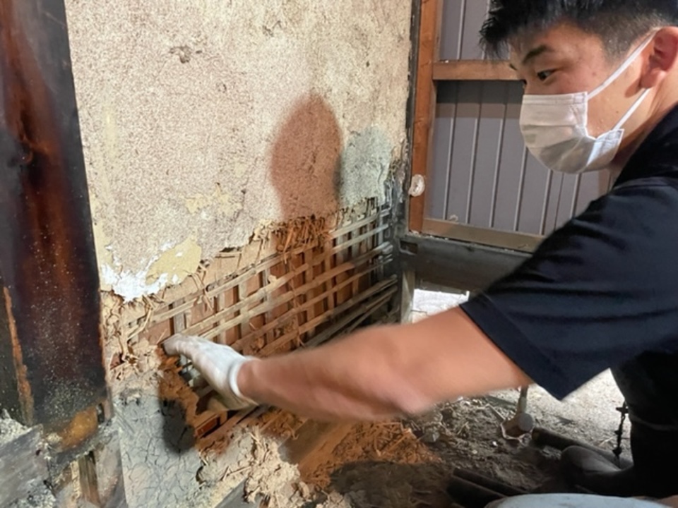 土台替えをするので、それに関わる土壁を落としています(寺西)