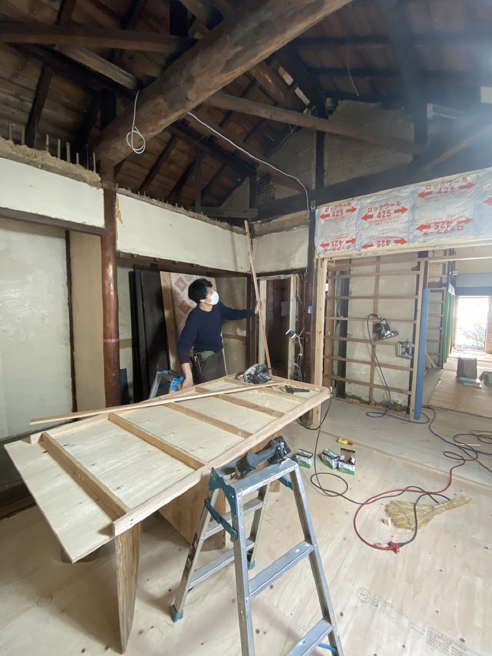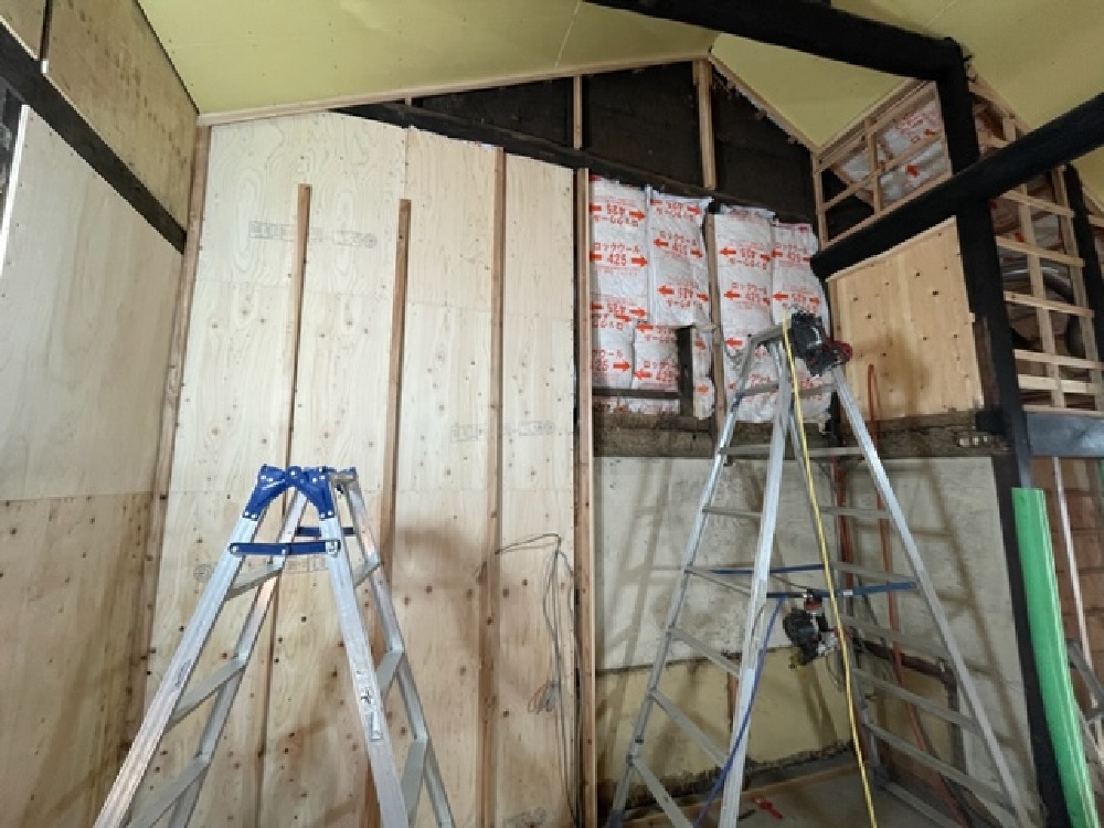 (物置小屋改修工事)引き続き壁下地などを行いました(三浦)