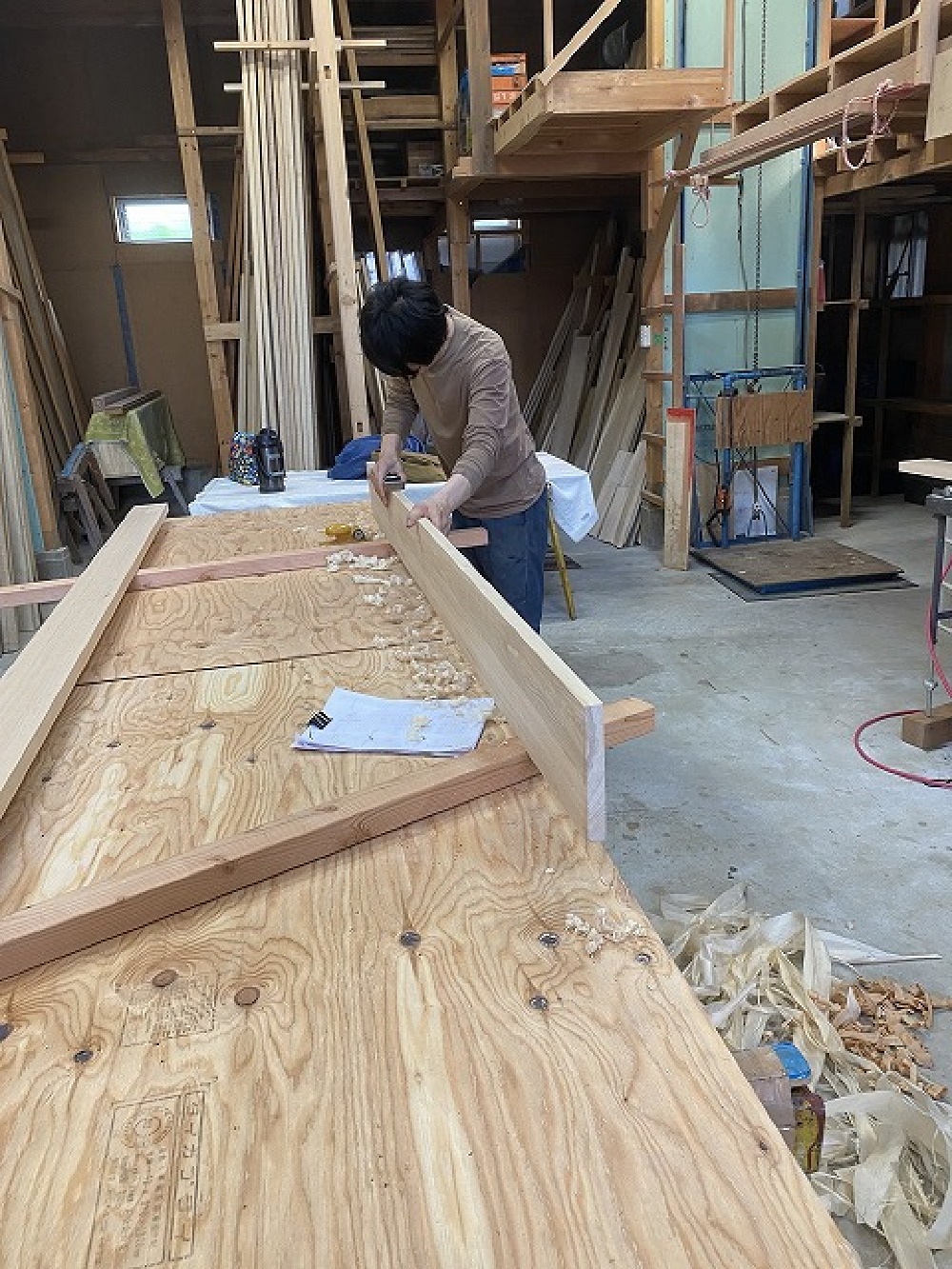 新しい土台を刻むてらちゃんと三浦君。新人の三浦君も技術を身につけるため、頑張って学んでいます