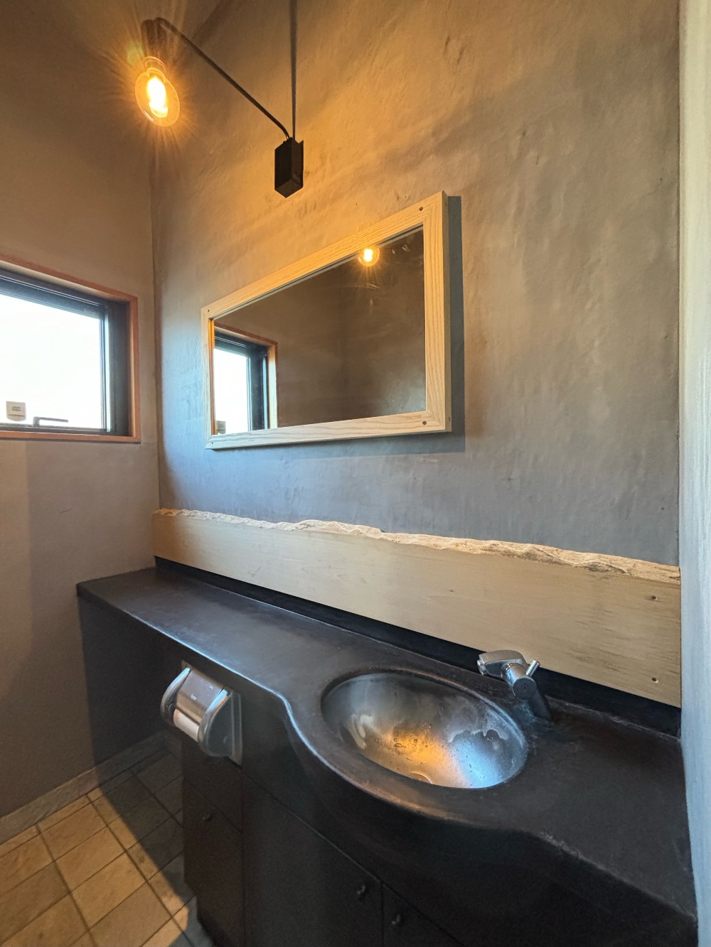 事務所トイレがお洒落な空間に変身しました。壁はモールテックスで仕上げています(白井)