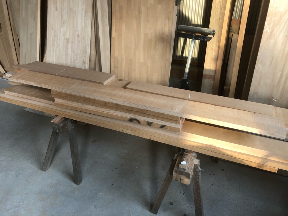 工場で、縁側の造作材を加工しました。松材無地です(西川)