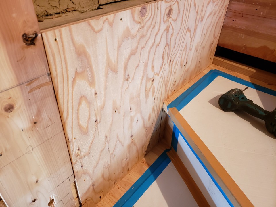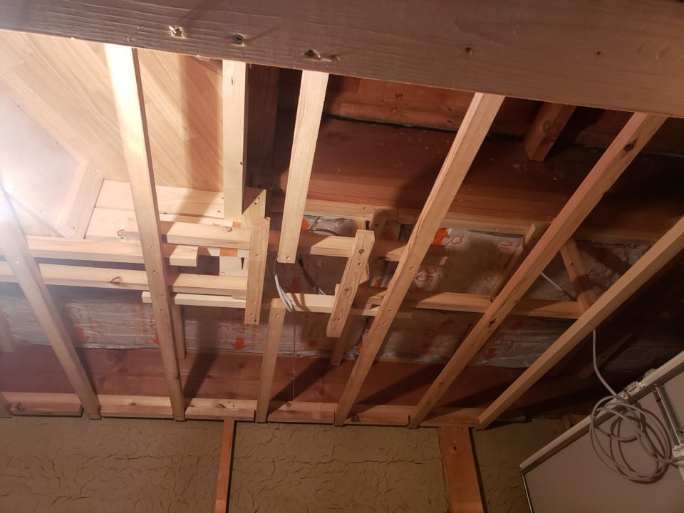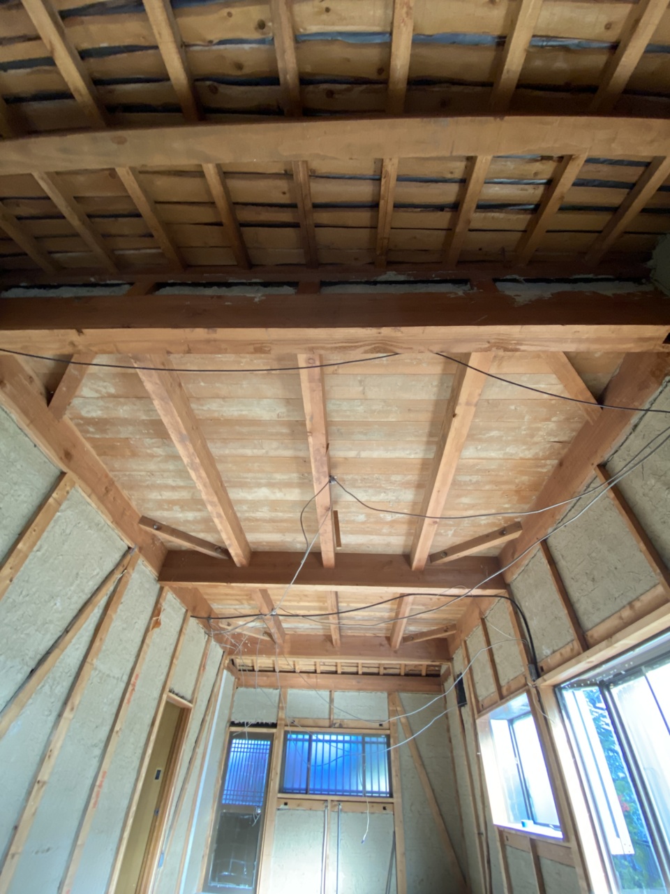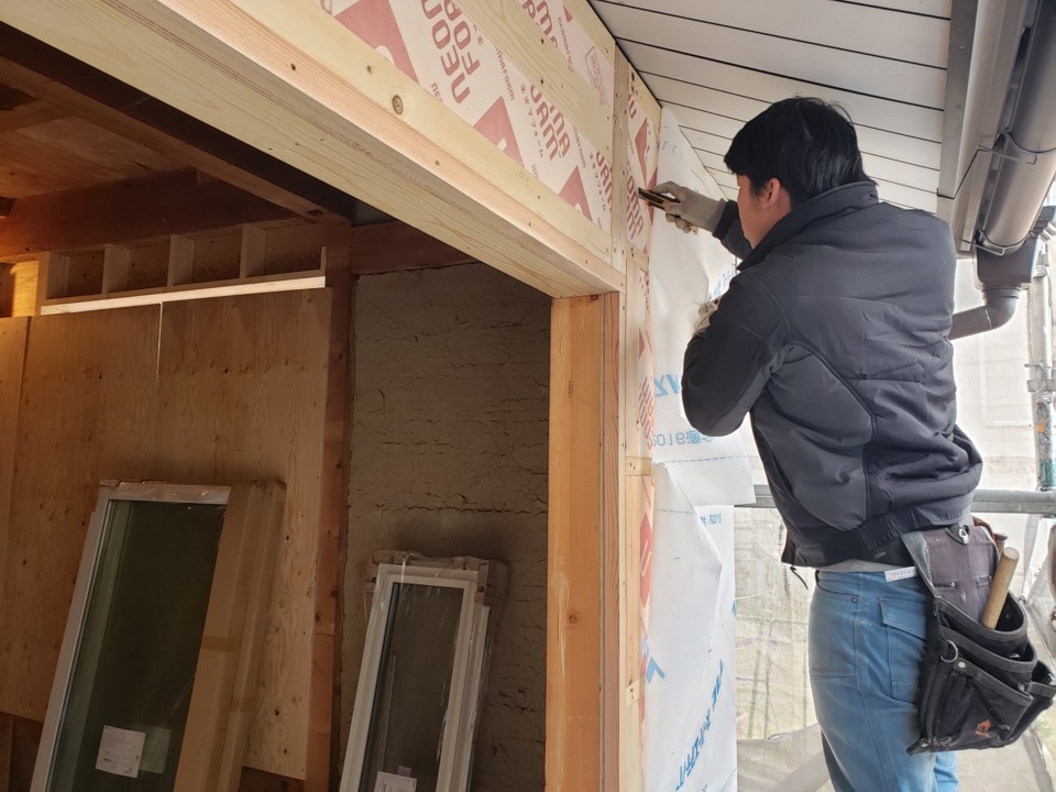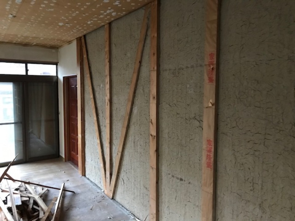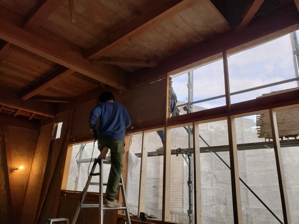 壁下地作成中。土壁を生かした補強、断熱をしていきます。