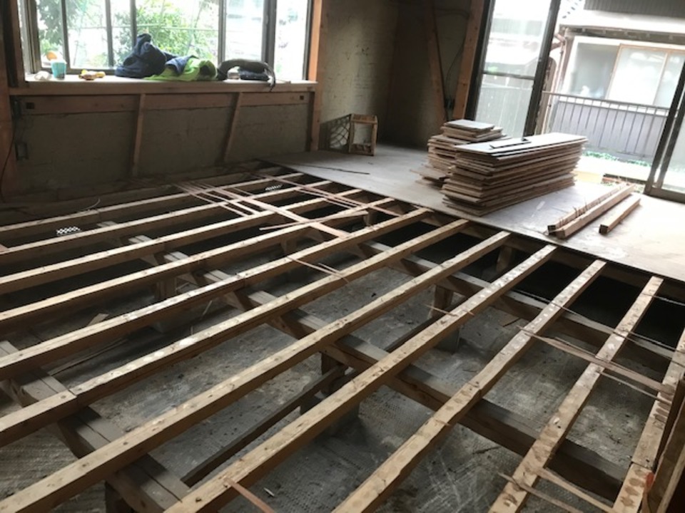 床鳴りをなるべく抑えるため、既設床材をビス締めしています(中川)