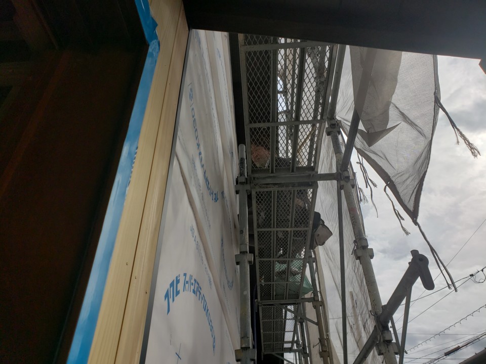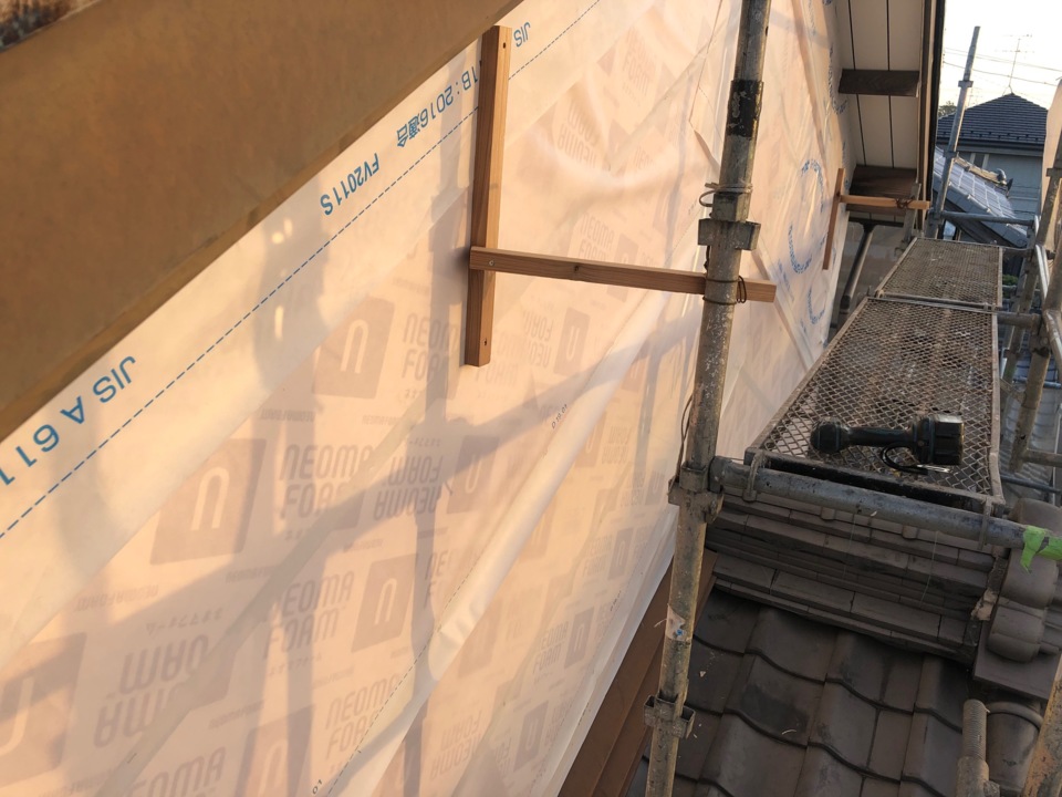 外壁下地施工中、外断熱材を施工してます(寺西)