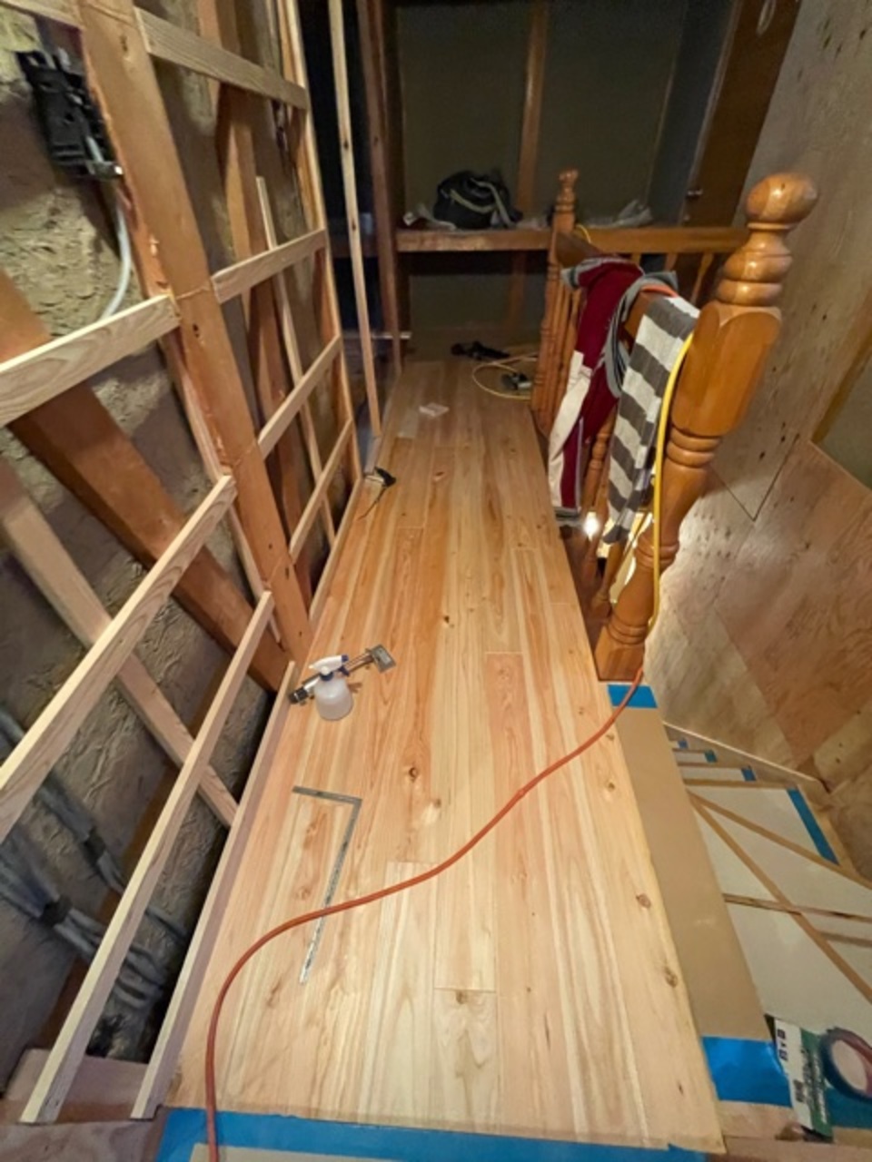 2階の吹抜ホールに、檜の床材を貼っています(中川)