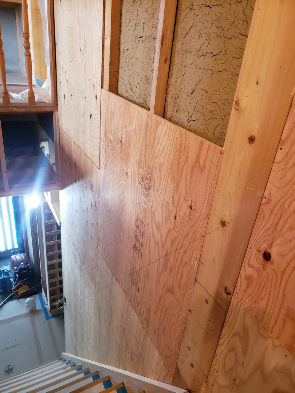 吹抜け部、スノコ完了。窓からの光を透過します(白井)