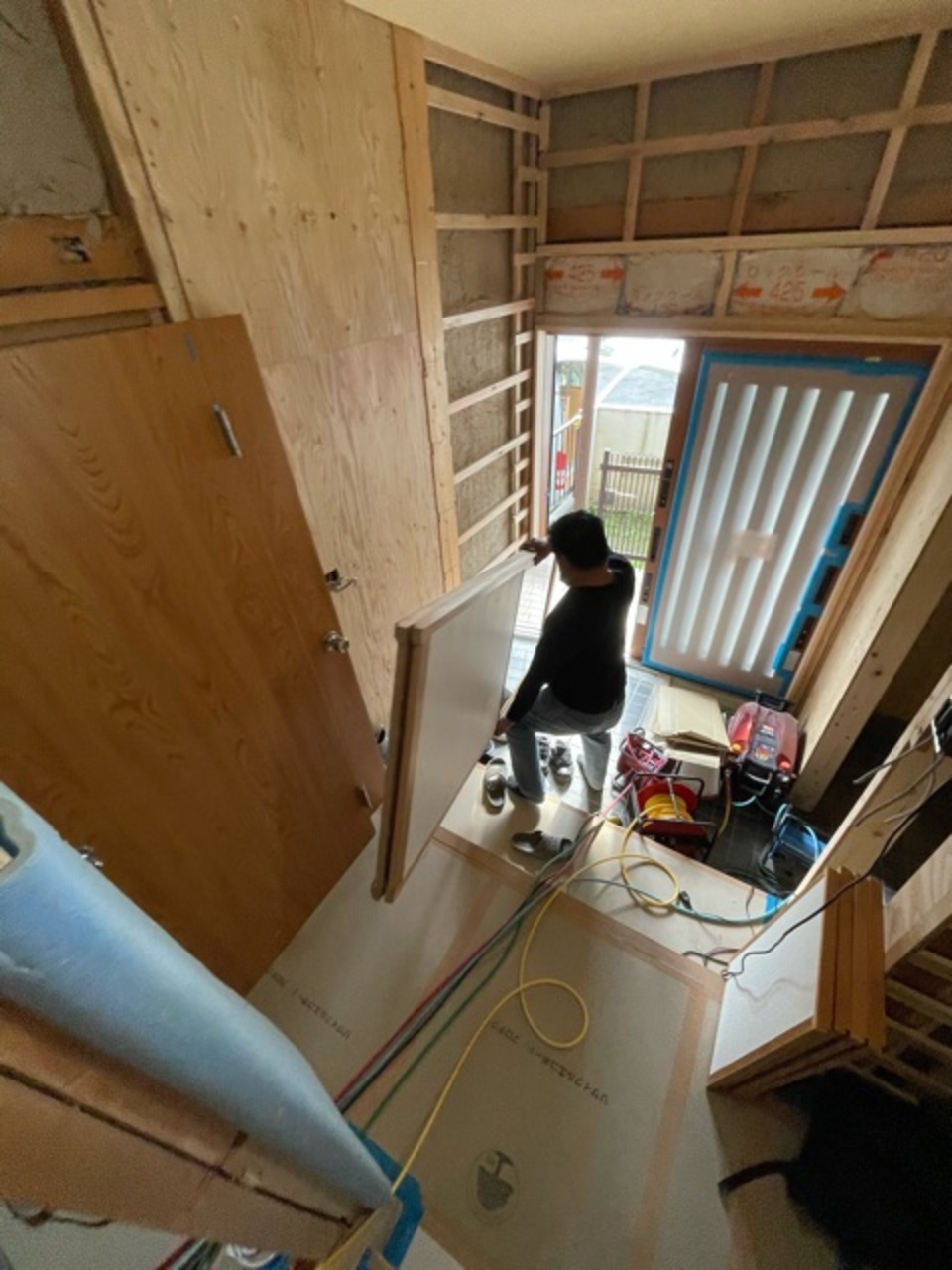 吹抜のスノコ工事に取り掛かる、白井君(中川)
