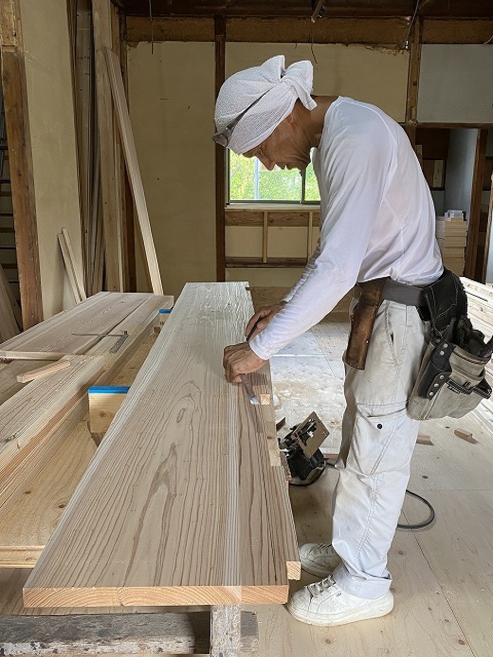既設のナラ床材を再活用する為、丁寧に取り外しています