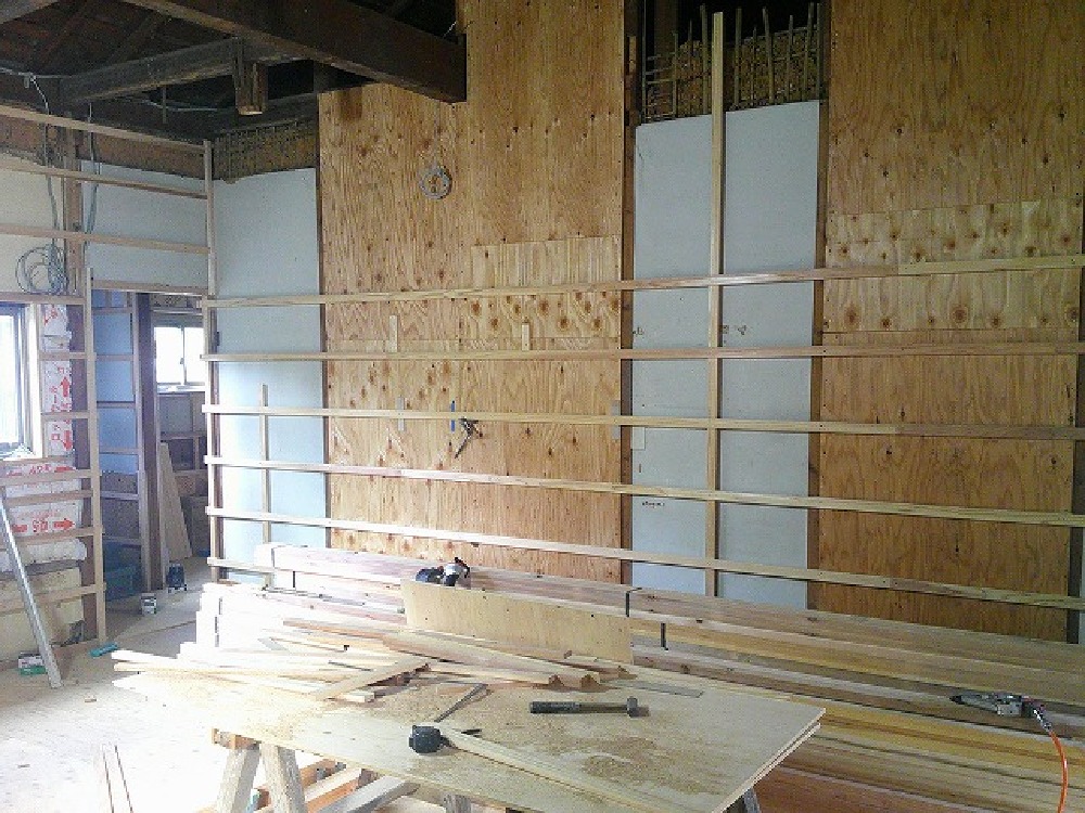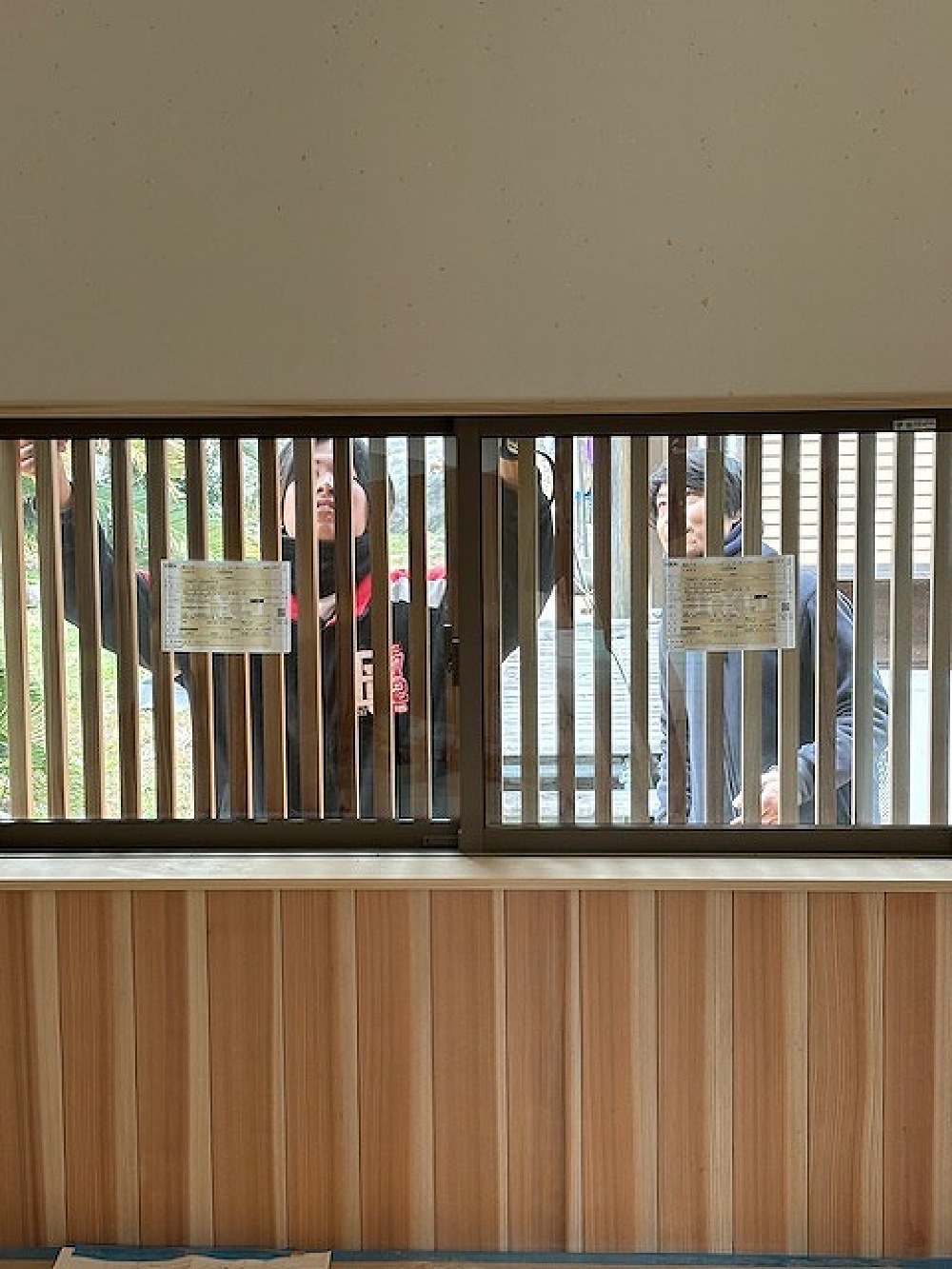 工場で作った 杉の無地材の格子の取り付け作業。総数は10ヶ所で、サイズは大小様々です。