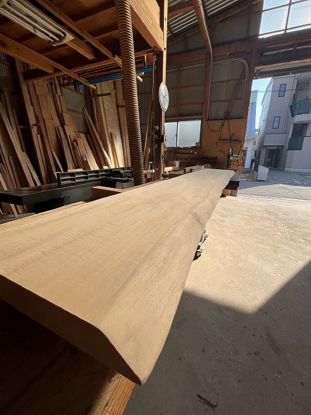 工場で手摺を作っています。サクラの無垢材から切り出した手触りよく、美しい手摺です。