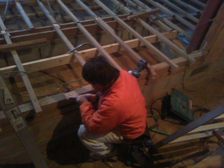 ロフトの合板をビスで締める荒チャン。