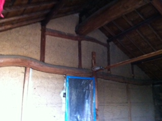 なべさんが2階のしっくいを塗っています。しっくいが塗られると梁が引き締まります。