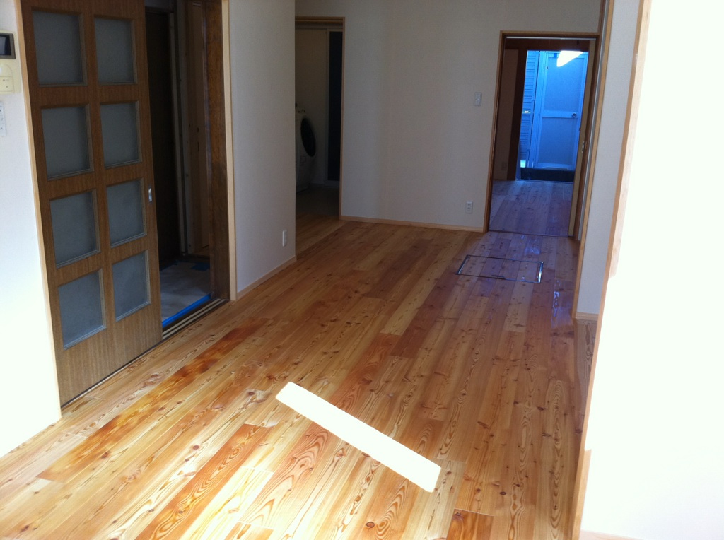 白井です。今日からカラマツのフローリングを張り始めました。