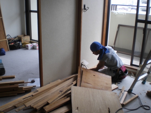和室の解体をしています。 なかさんが、丁寧に壁下地を撤去しています。