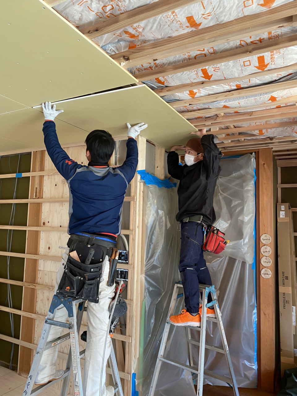 今日はボード施工。快調に進んでいます