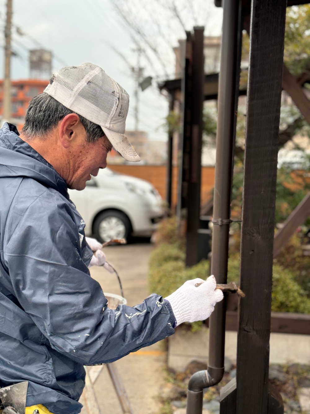 マツミ事務所・川脇塗装さんが外部ポーチの柱の塗装に来てくれました
