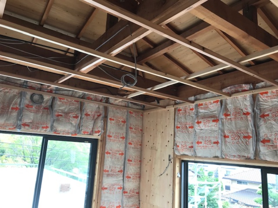 寺西です。小屋組みを金物でしっかり補強してから、天井下地を施工します。