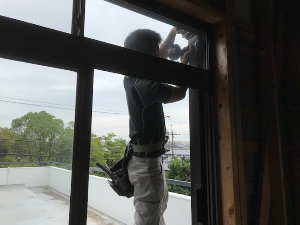 寺西です。既存のサッシを高性能サッシに交換中の荒木くんです