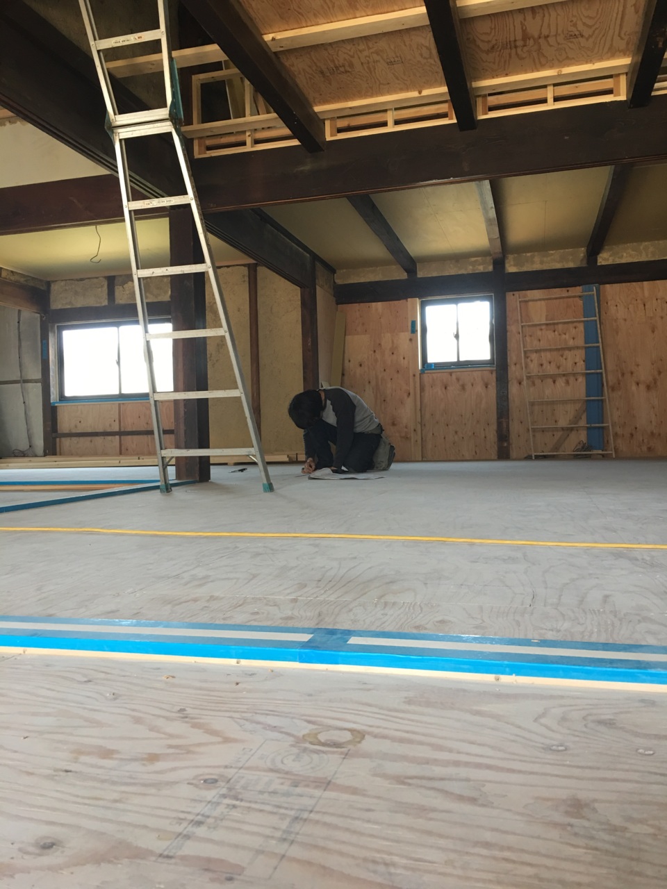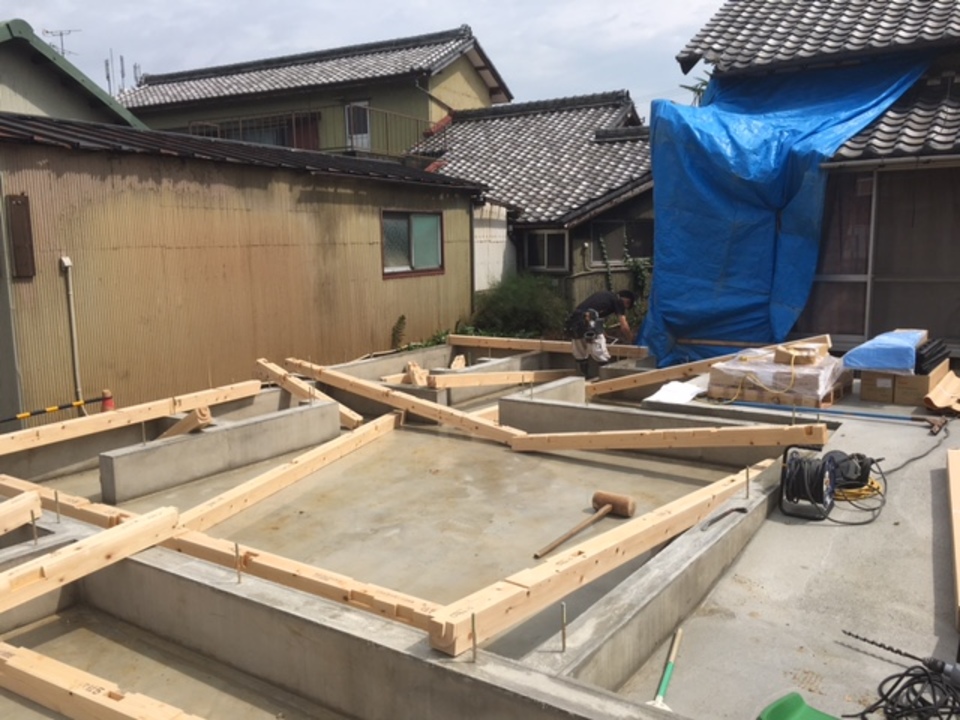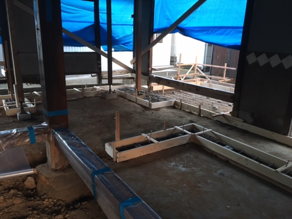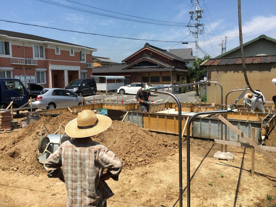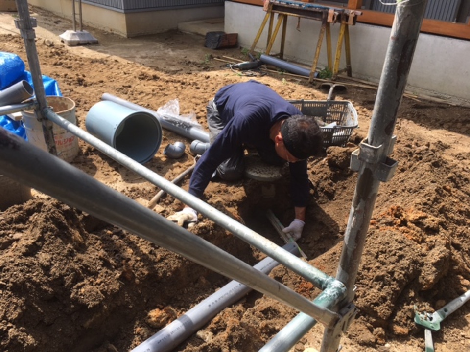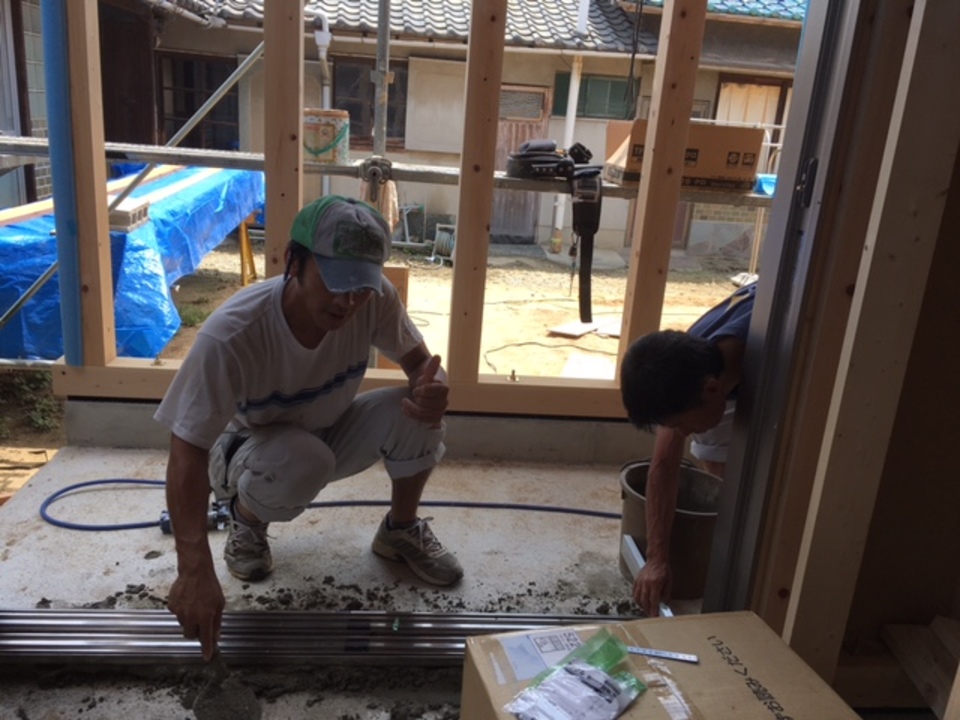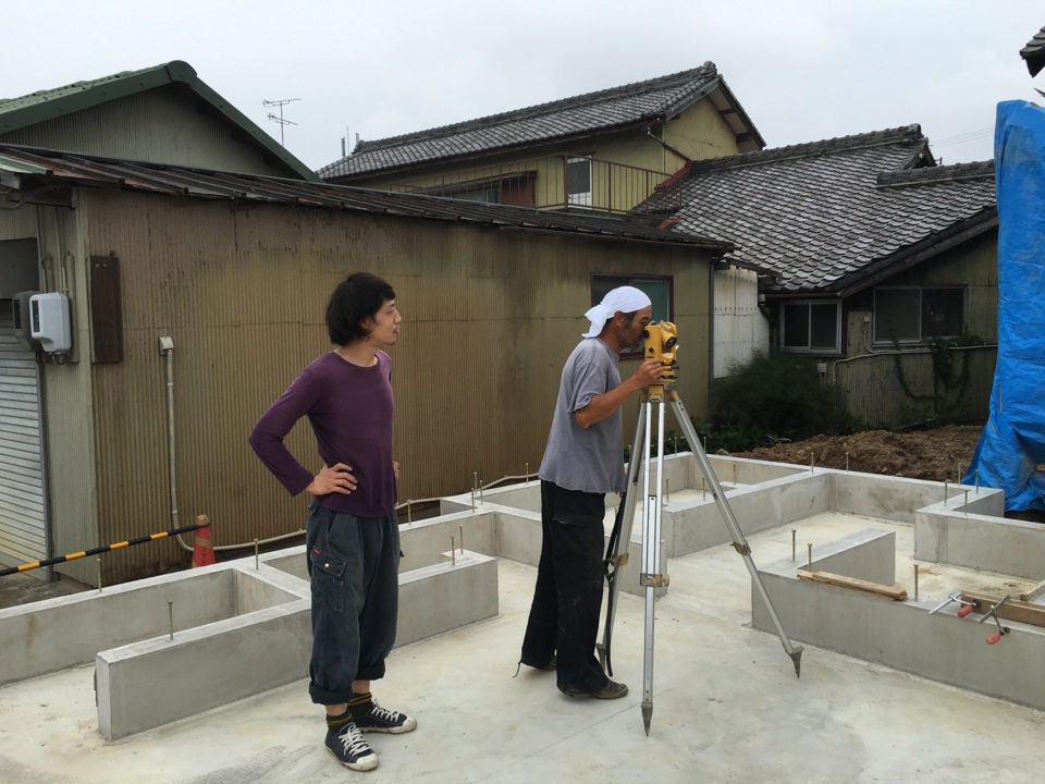 中川です、土台敷きにきました。まずは朝から水掻きです!