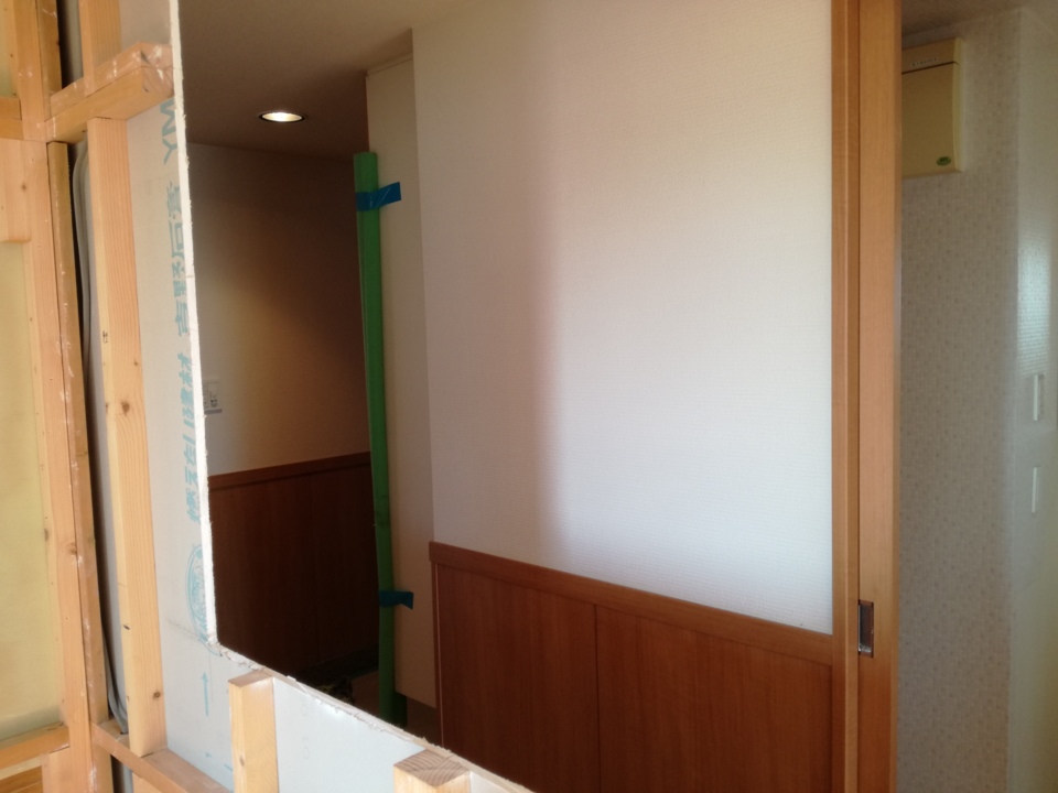 荒木です。漆喰下塗りでは埋める事ができない場所は、補修でPBを埋めていきます。