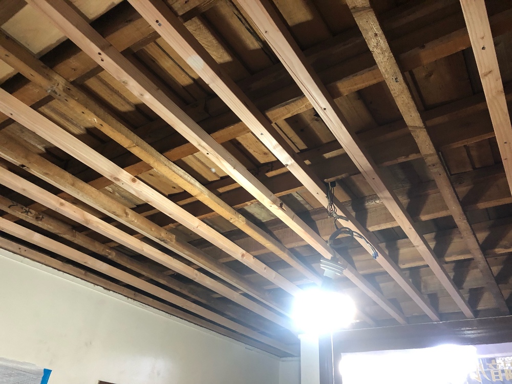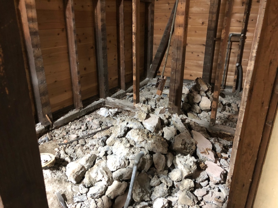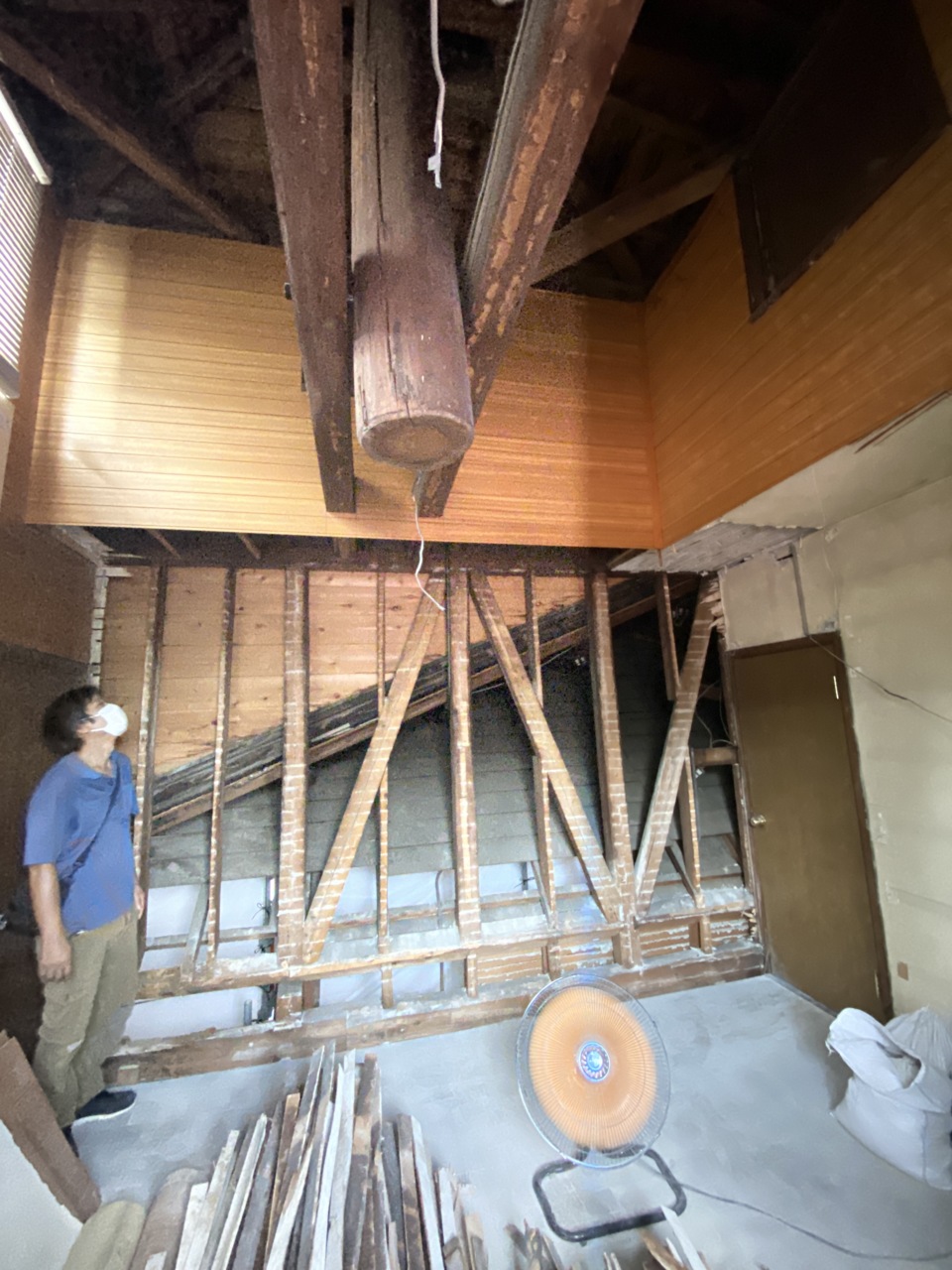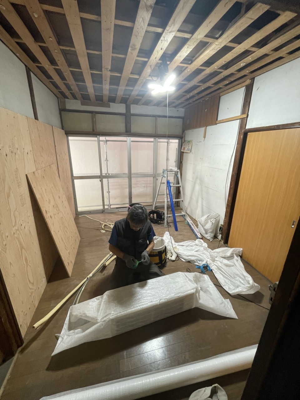 白井です。既存のキッチンを解体し壁に断熱を施しています。