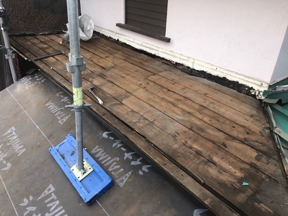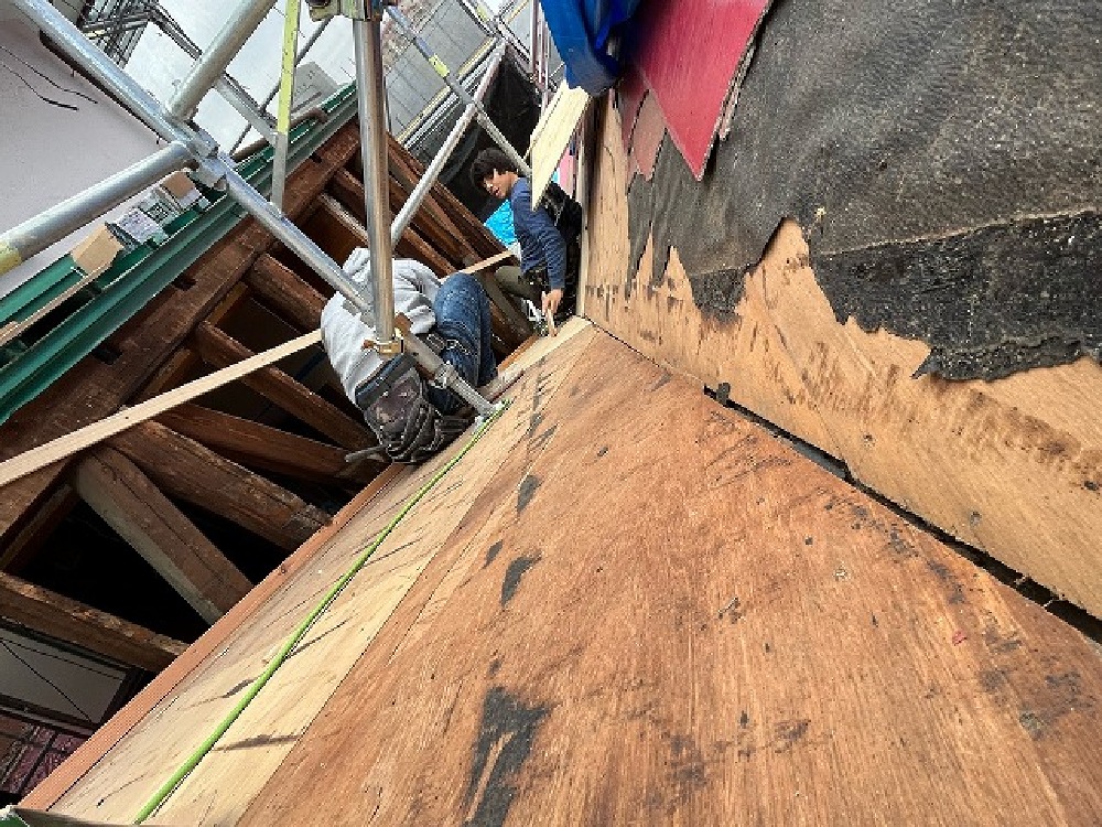 山本です。耐震補強のため、構造用合板を貼り進めています。
