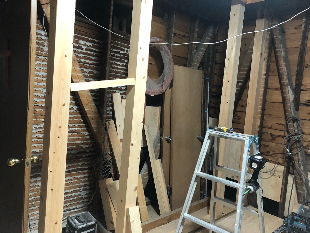 内部工事も最終段階です。 見切材を付けたので壁貼り作業です。 丸太は十字架塔屋の芯柱です(白井)