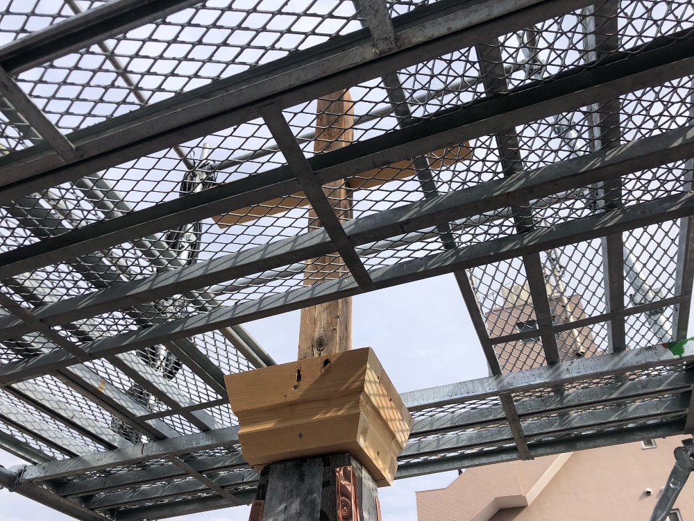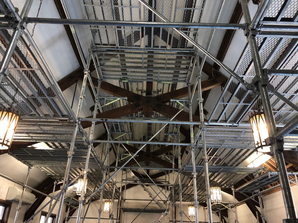 礼拝堂内部、足場設置完了。 近距離でトラス部が見れます。 チェックして、塗装工事開始予定(白井)
