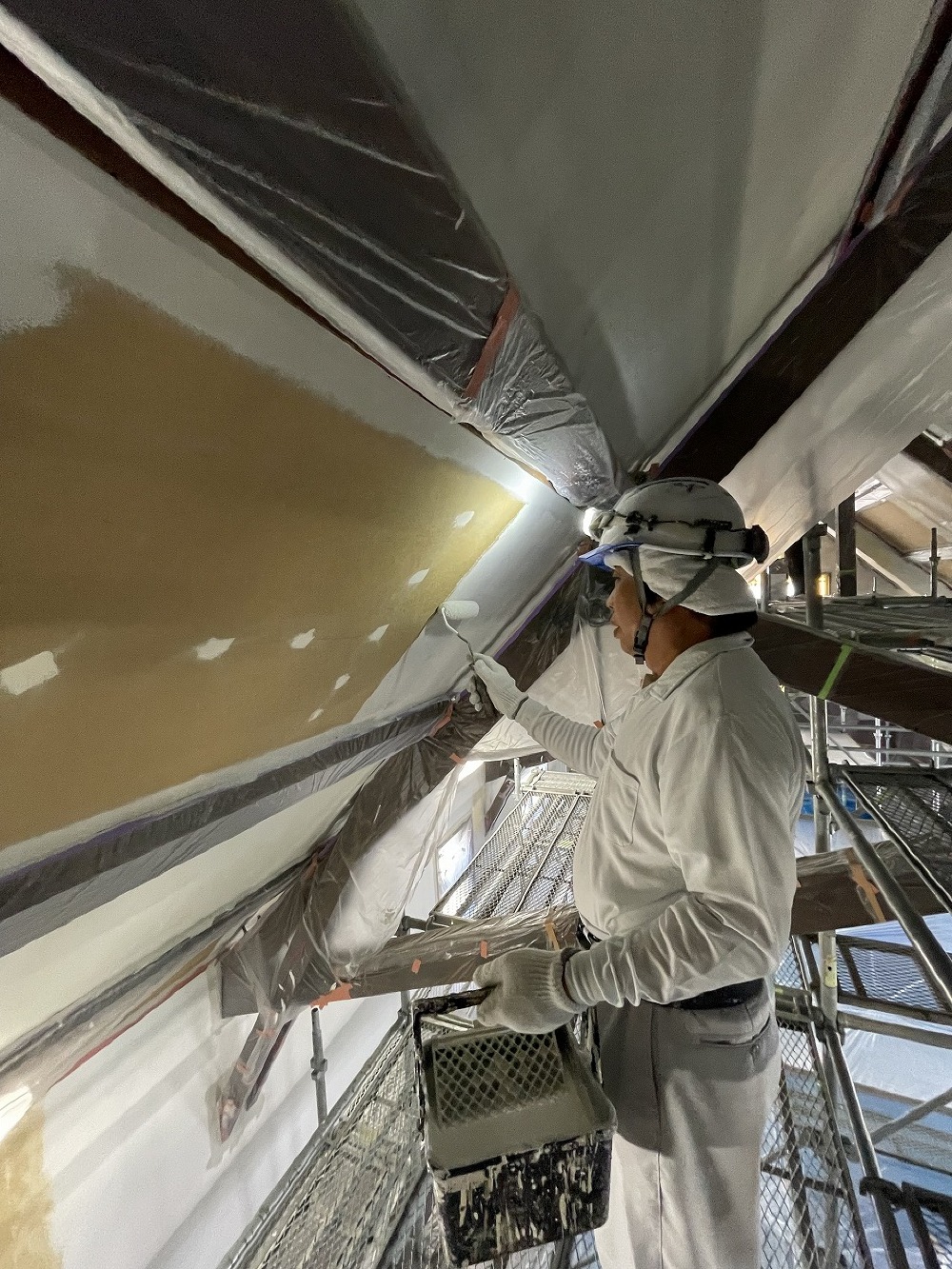 ルーテル教会礼拝堂の勾配天井は残り塗装だけになりました(三浦)