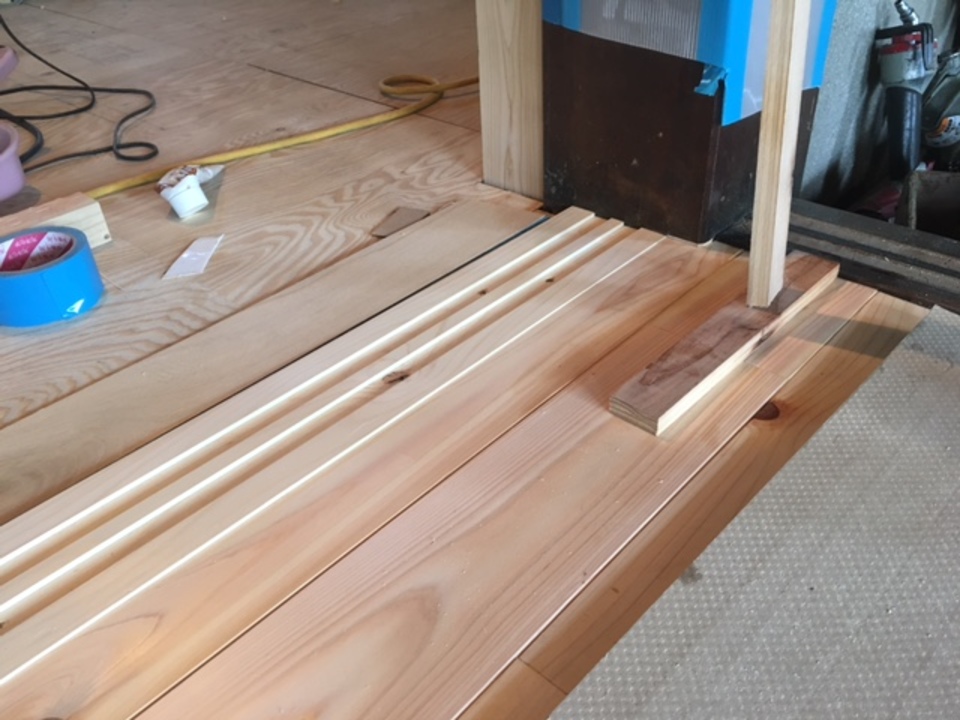 枠材を加工するしらはん。これから、洋室の3本吊り込みの建具の枠を取り付けます。